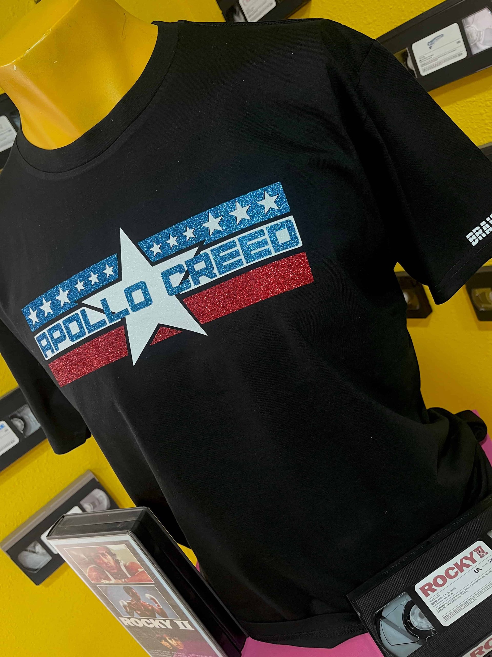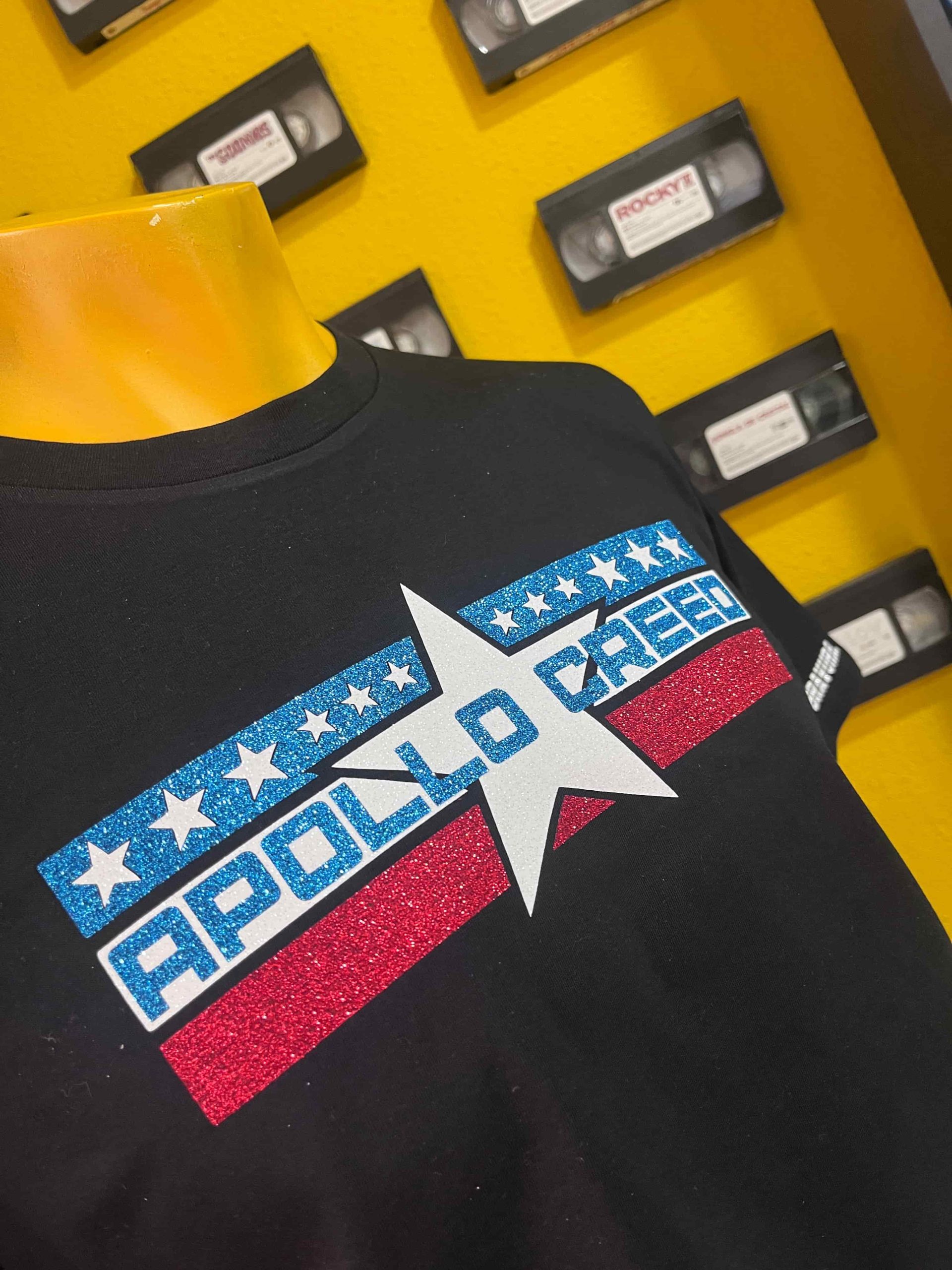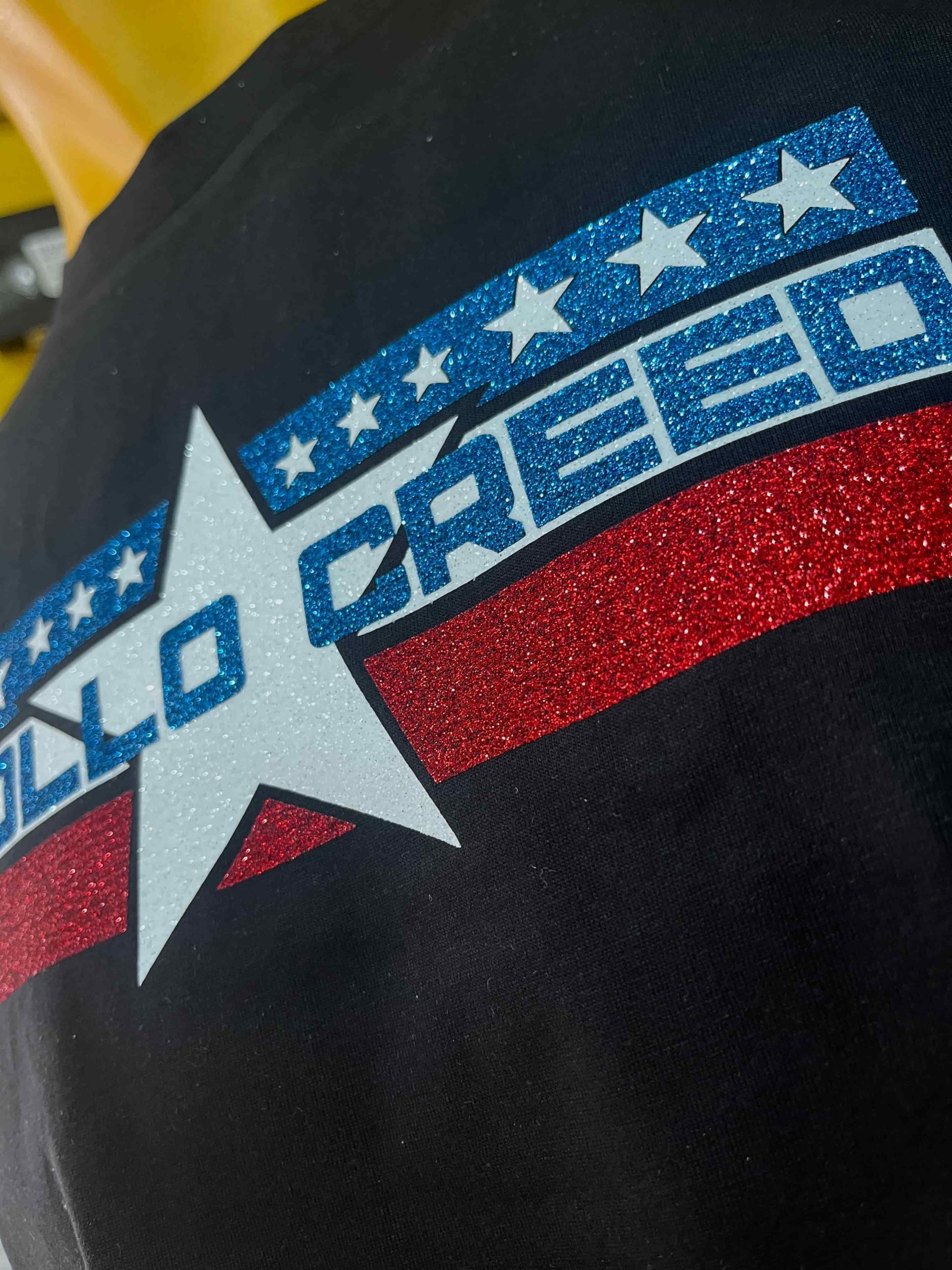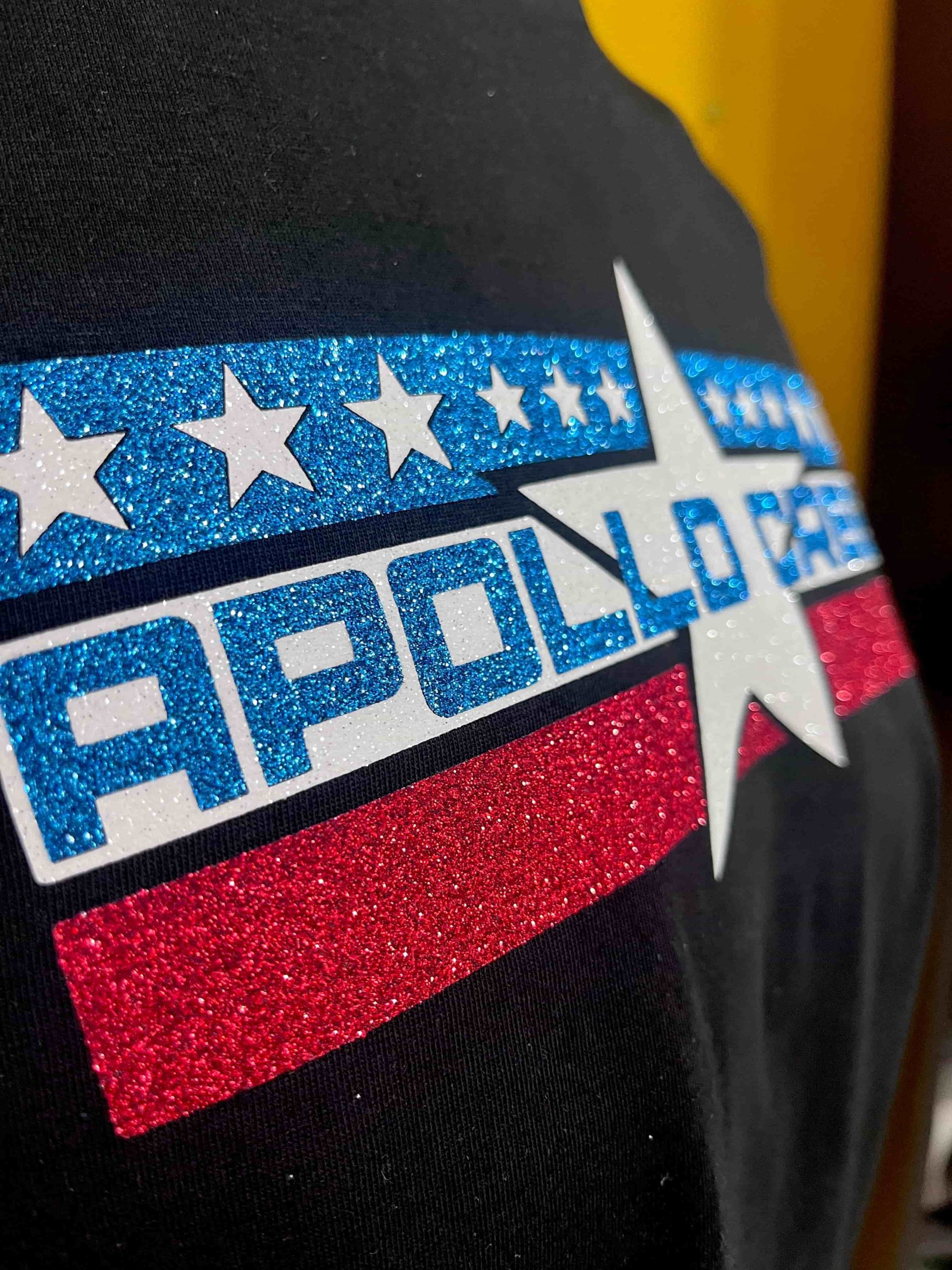 Hemos hecho una camiseta de Apollo como era Apollo, brillante, TODO es Glitter, azul, rojo y blanco que sin ser exagerada, llama la atención.