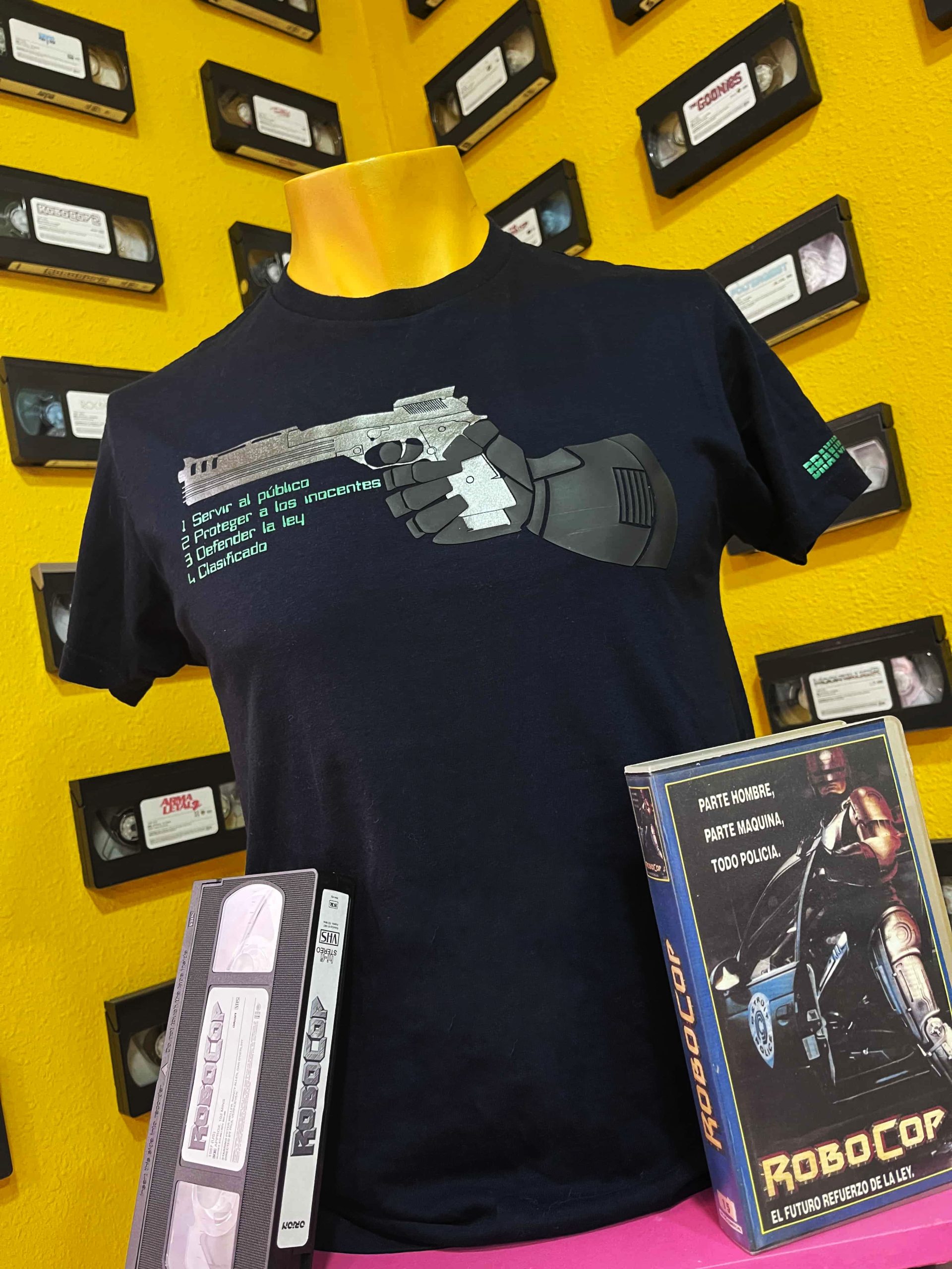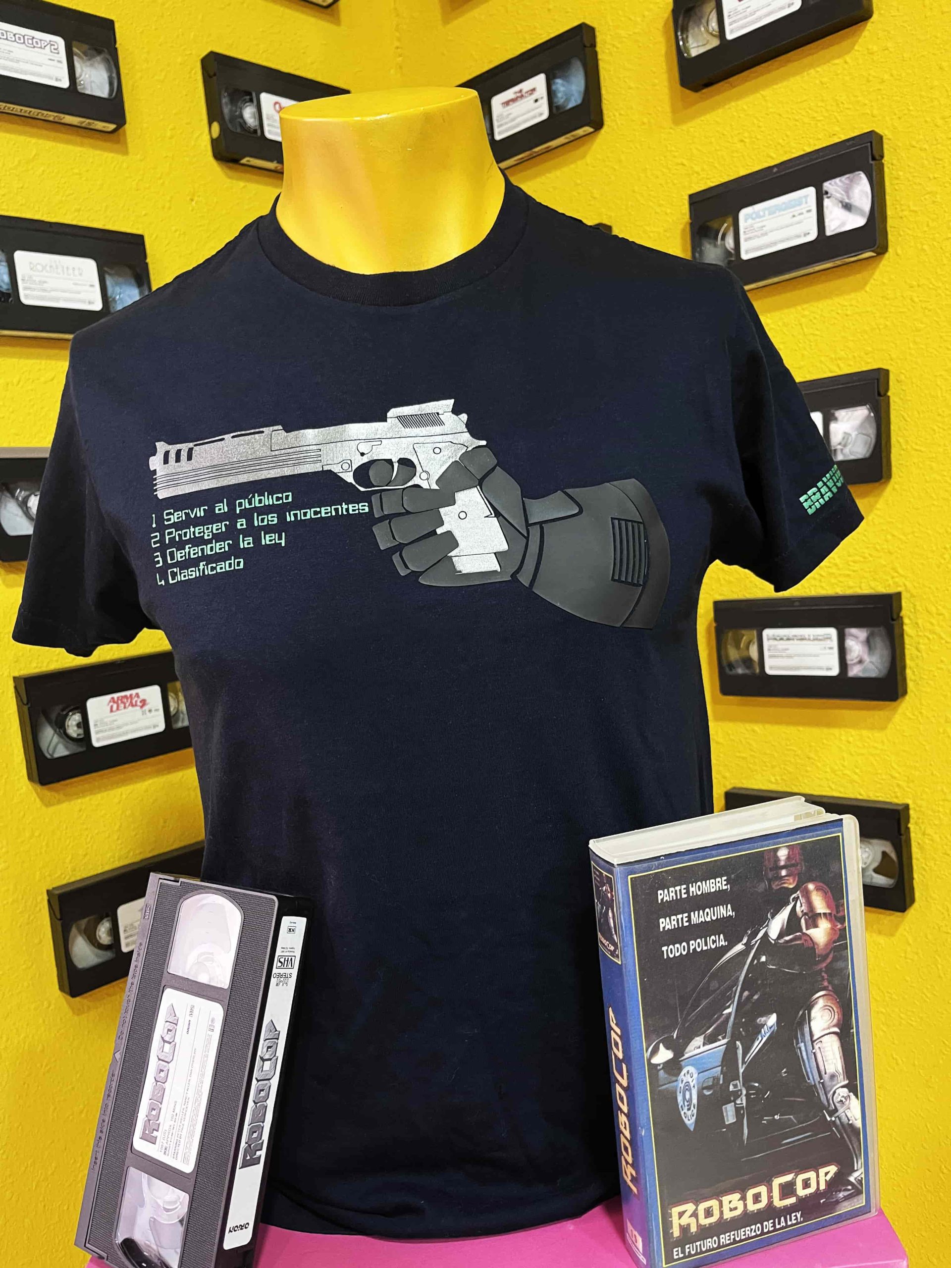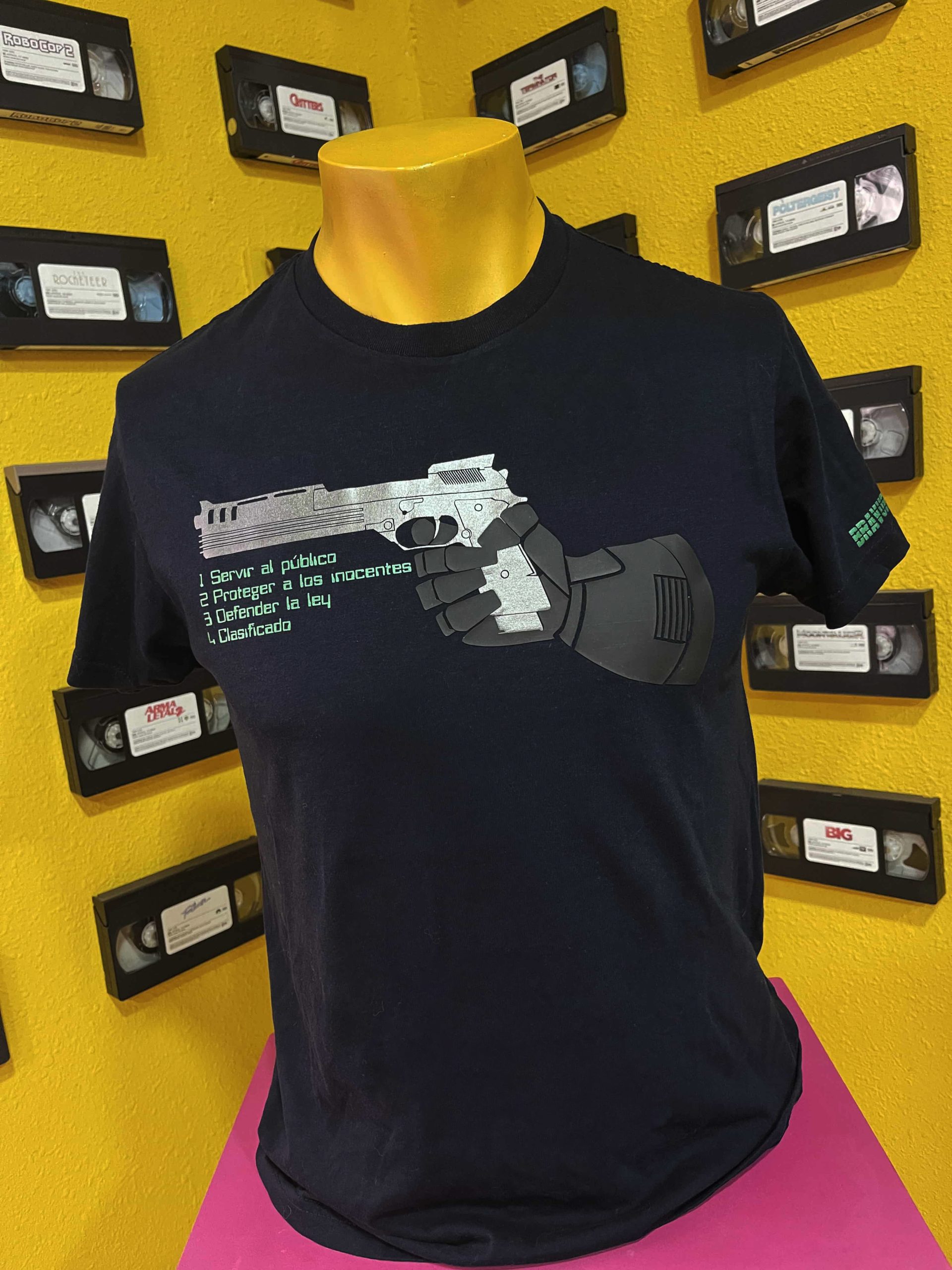 Aquí hemos querido rememorar al personaje a través de su emblemática arma (Beretta 93r Auto 9) en un ESPECTACULAR color Metalizado Gris Beskar agarrada por la mano de Alex J. Murphy en goma relieve en negro que os recordará totalmente al personaje y   las directrices que le guiaban en Verde metalizado que rememora a las pantallas de fósforo de la época.