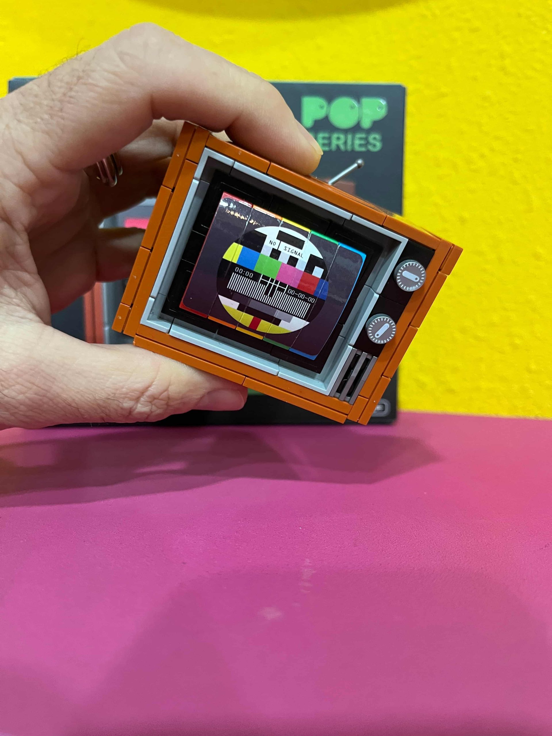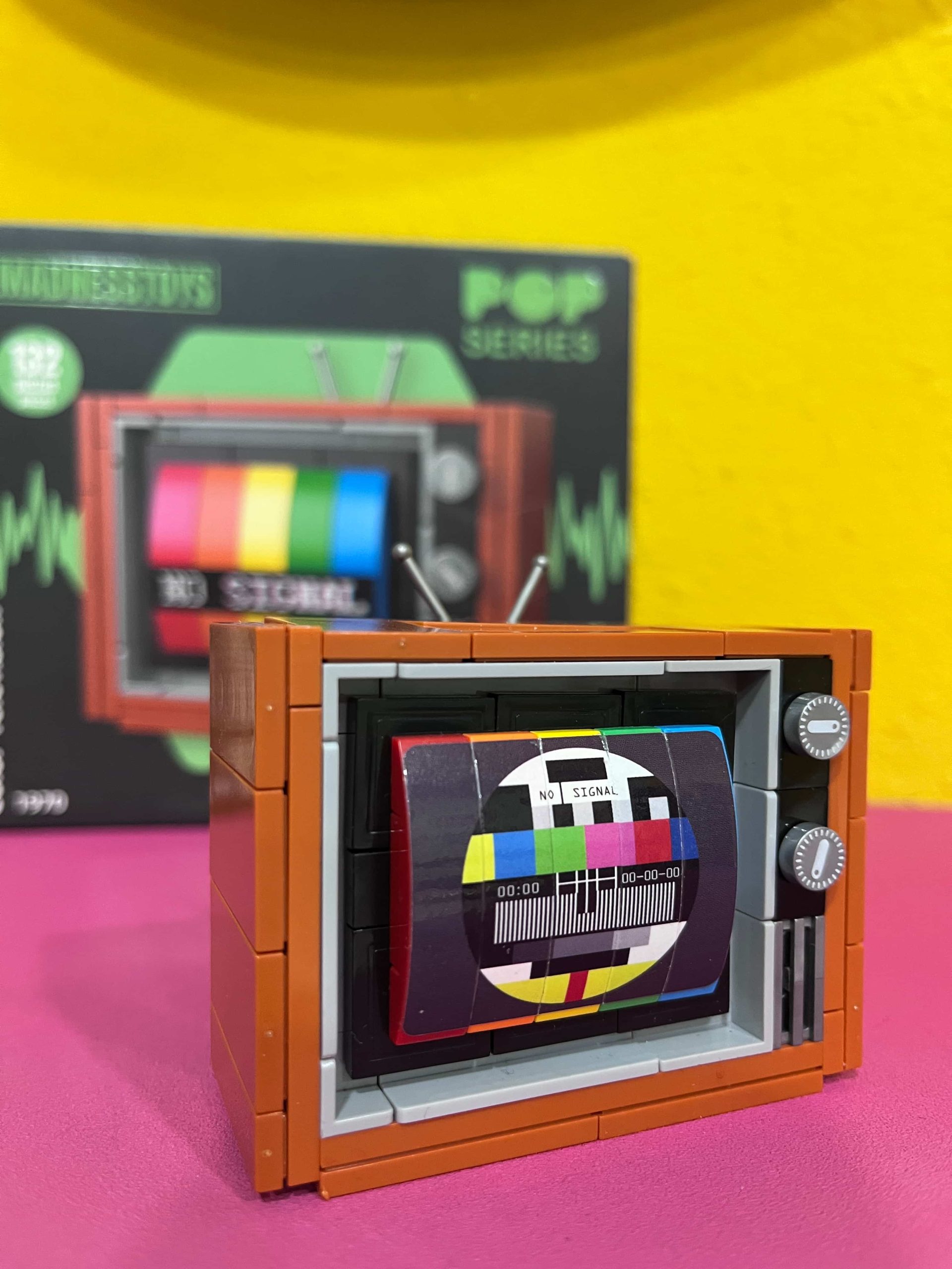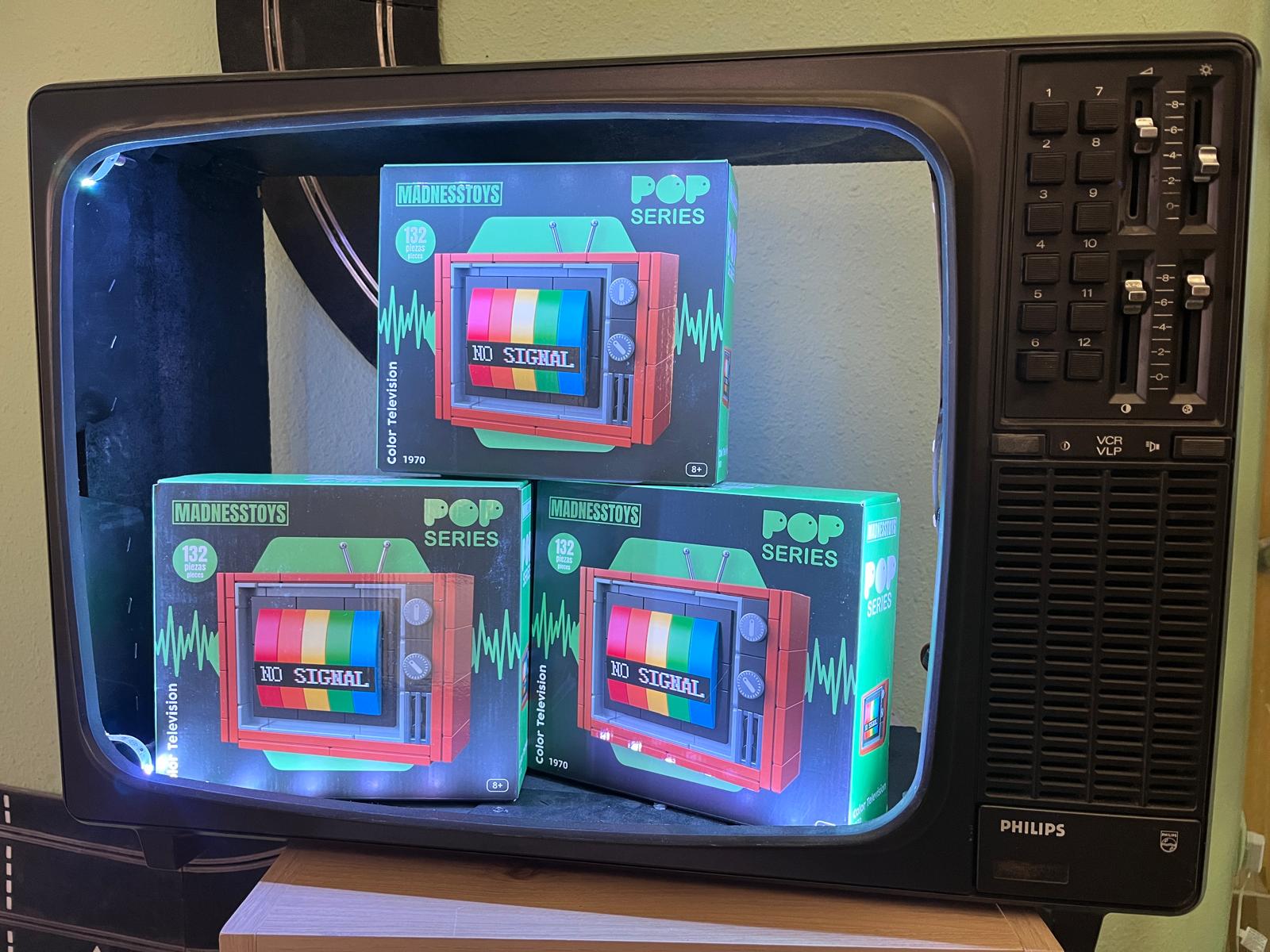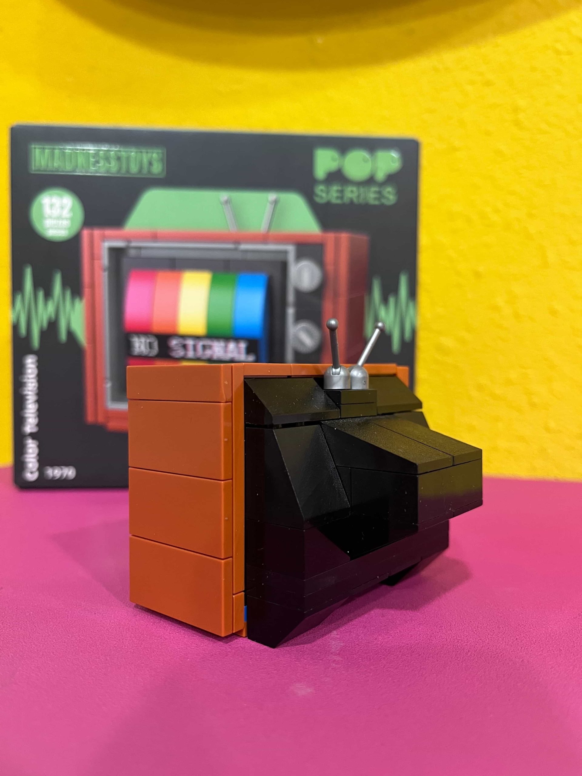 Este modelo de piezas compatible con la mas famosa marca de ladrillos montables, te transportará al inicio de la televisión a color, con esas viejas televiones Telefunken, Philips, Emerson de color: imitación a madera y sin mando a distancia…